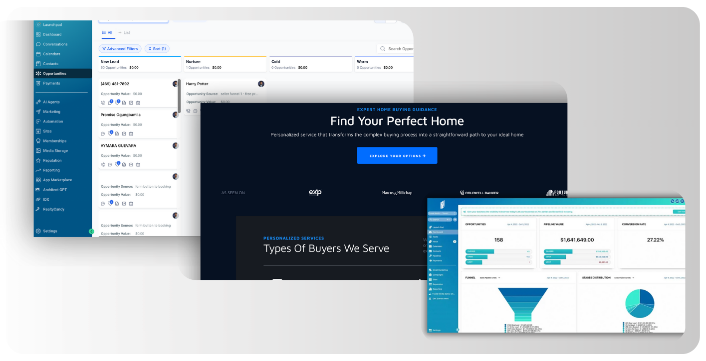 Manage your entire client journey in one powerful platform. Our complete system includes high-converting landing pages and strategic funnels that feed directly into your CRM for seamless lead management.